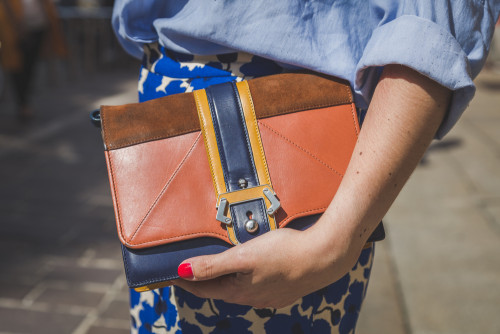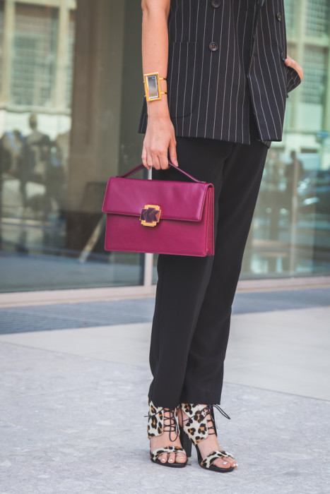 Nicht nur auf den Laufstegen, auch außerhalb der Milan Men’s Fashion Week 2015 zeigen Frauen ihr liebstes Hobby, die Handtasche. Dieses schicke Modell ist in der Trendfarbe Lila unübersehbar. Die schlichte Form mit Tragegriff erhält ihren Eyecatchter durch einen recht auffälligen Verschluß auf der Vorderseite.