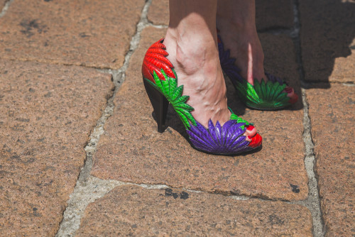 Bei der Ferragamo Fashion Show waren diese Schuhe nicht zu übersehen. Kräftige Farben und ein außergewöhnliches Design, das an Canabis-Blätter erinnert, zogen die Blicke auf sich. Wir finden, die extravaganten Schuhe würden perfekt zur vorbeschriebenen, schlichten Handtasche passen.
