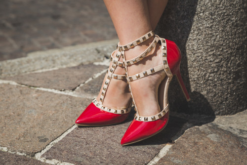 Wer kennt diese Schuhe nicht. Jede Frau träumt davon, die roten Stilettos von Valentino Rockstud ihr Eigentum nennen zu dürfen. Sehr auffällig sind hier die feinen Riemchen mit Nieten in Hautfarbe. Der Preis dieser Schuhe liegt um die 700 Euro.